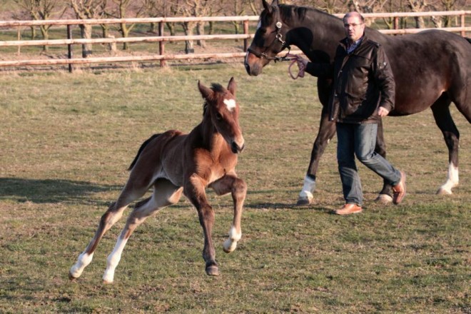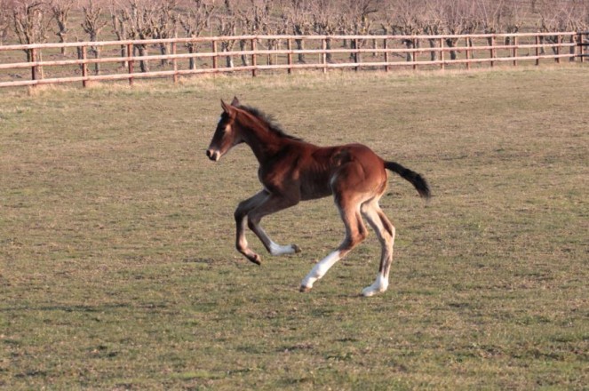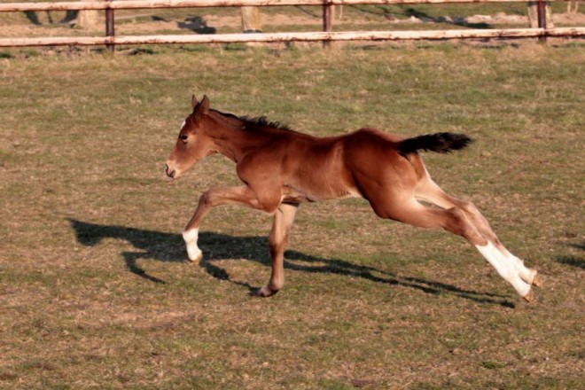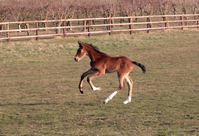 Bonita, geb. am 25.03.2013 genießt die Frühlingssonne. Nach nunmehr zwei Wochen schlechtem Wetter konnte sich die Kleine nun zum ersten Mal so richtig austoben. Weitere Fotos unter Fohlen.