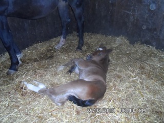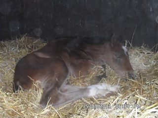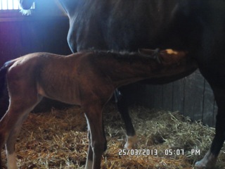 Am Montagmorgen um 8.15 Uhr war es endlich so weit. Die StPrSt Fine Lady von Fidermark hat ein gesundes braunes Stutfohlen von Belissimo M zur Welt gebracht. Wir sind froh, dass die Geburt gut verlief und Mutter sowie Fohlen wohl auf sind. Tapsig mit seinen langen Beinen tapst es durch die Abfohlbox, sucht Mama und erforscht seine Umgebung.