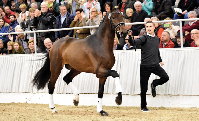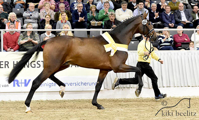 “Er sorgte für die Sensation im Körherbst 2015! Die Superlative überschlugen sich, das „Millionending“ machte schnell die Runde. Drei Grundgangarten höchster Qualität, dazu schwungvoll und elastisch zu jeder Sekunde. Nie zuvor hat ein zweieinhalbjähriger Warmbluthengst auf einer Körung mehr gekostet als dieser Ausnahmehengst – 1,2 Millionen Euro. Sein Vater Rocky Lee steht hoch im Blut. Nicht nur über den Vater Rock Forever, der nach Erfolgen im Finale des Nürnberger Burgpokals mittlerweile im Grand Prix Sport angekommen ist, sondern auch über seinen Mutterstamm führt der in S-Dressuren siegreiche Rocky Lee mehrfach das wertvolle Leistungsblut des Ramzes. Seine Mutter hat den großrahmigen Vollblüter Justinian xx zum Vater. Aus Rocky Lees Mutterstamm sind gehäuft Dressur- und Springpferde mit Erfolgen bis Klasse S hervorgegangen. Seine dritte Mutter ist eine Vollschwester zum einflussreichen westfälischen Vererber Rigoletto. Revolutions Mutter hat den Holsteiner Rouletto zum Vater, der ebenfalls zweimal Ramzes führt. Die Häufung dieses Leistungsgaranten machen Revolutions Abstammung hoch interessant. Rouletto hat viele S-erfolgreiche Pferde für alle Sparten geliefert. Alle Mütter in den ersten Generationen sind im Basissport geprüft. Der Mutterstamm mündet in eine reine Vollblutfamilie.” Hengststation Klatte / Andreas Helgstrand